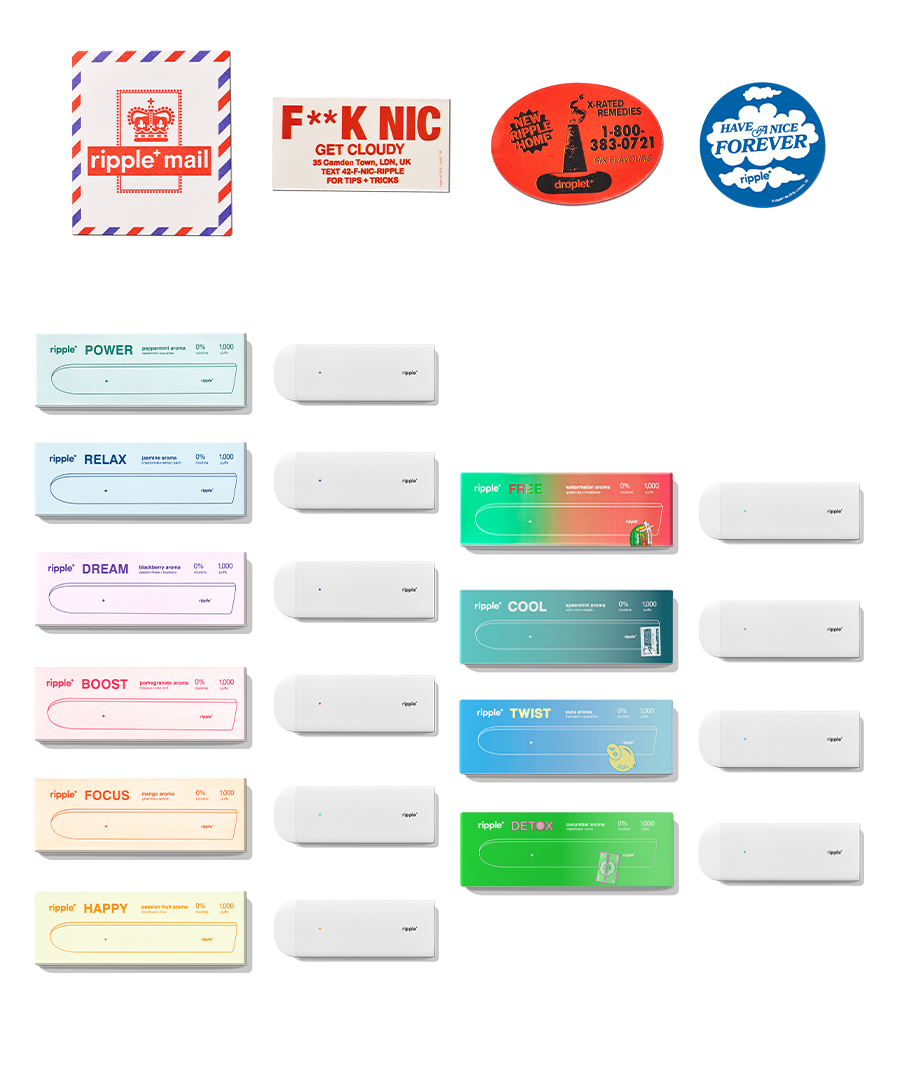 You have every ripple⁺ aroma available at the tip of your fingers. 10 aromas. 10,000 puffs. Non-stop enjoyment. This experience will leave you in a cloudy state, but you’ll be experiencing the ripple⁺ world in full effect.