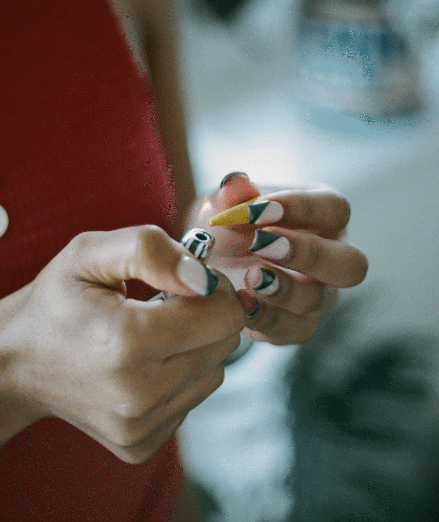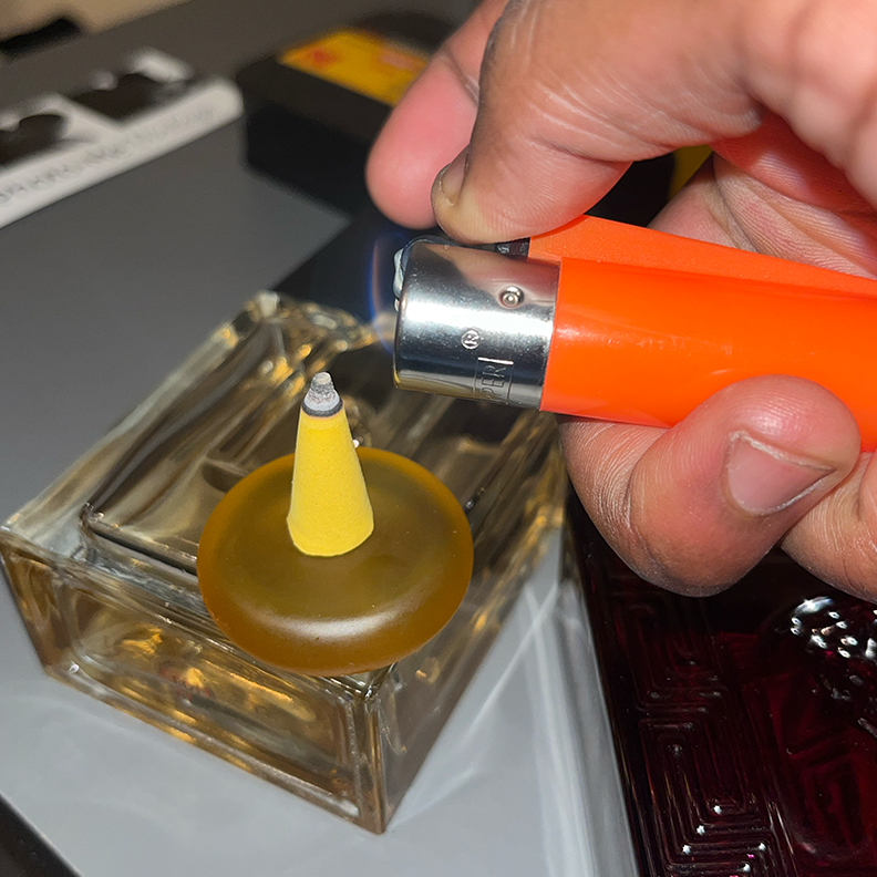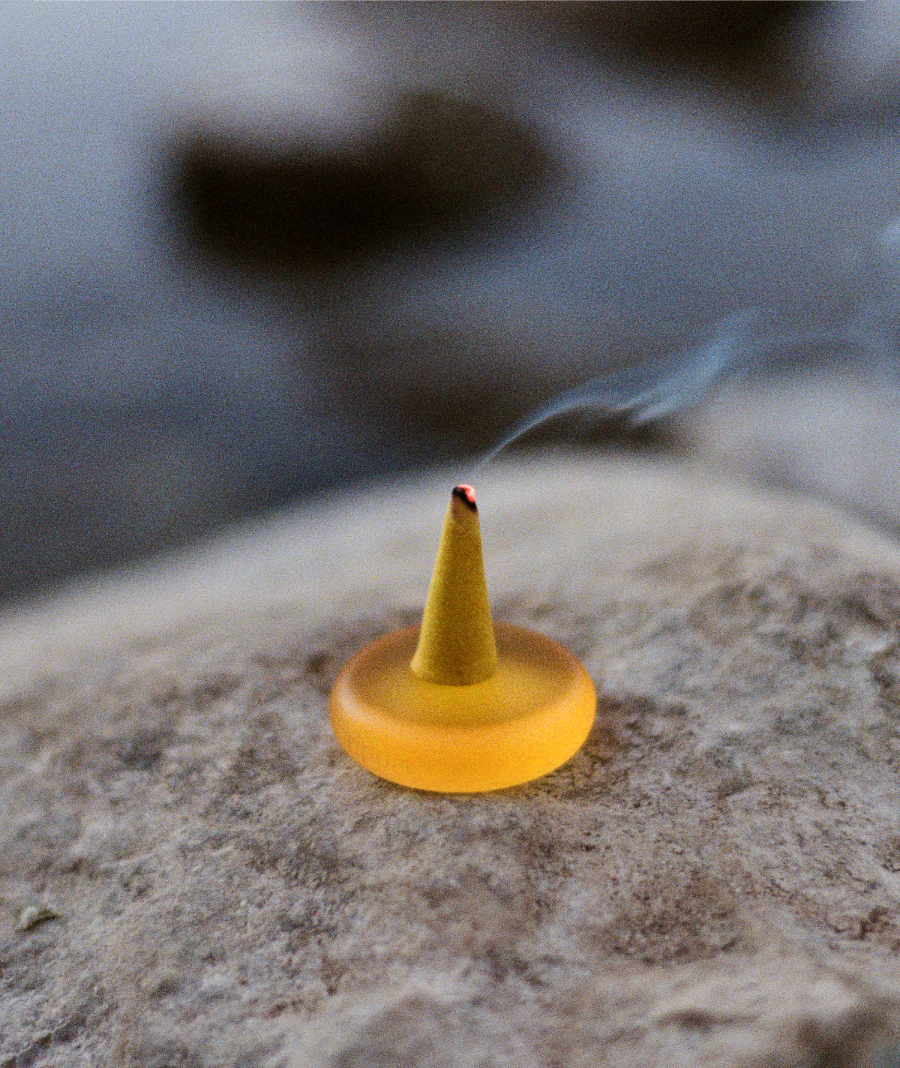 Place your droplet on top of the sea glass holder, grab your light, light the tip of your droplet and gently blow out after a few secs. Now, settle down & let the flame burn.