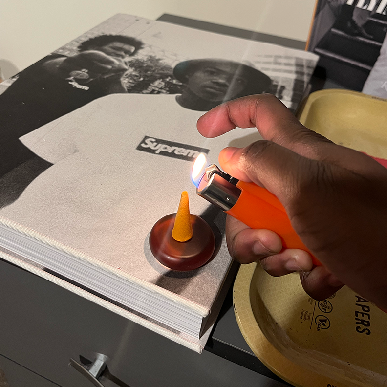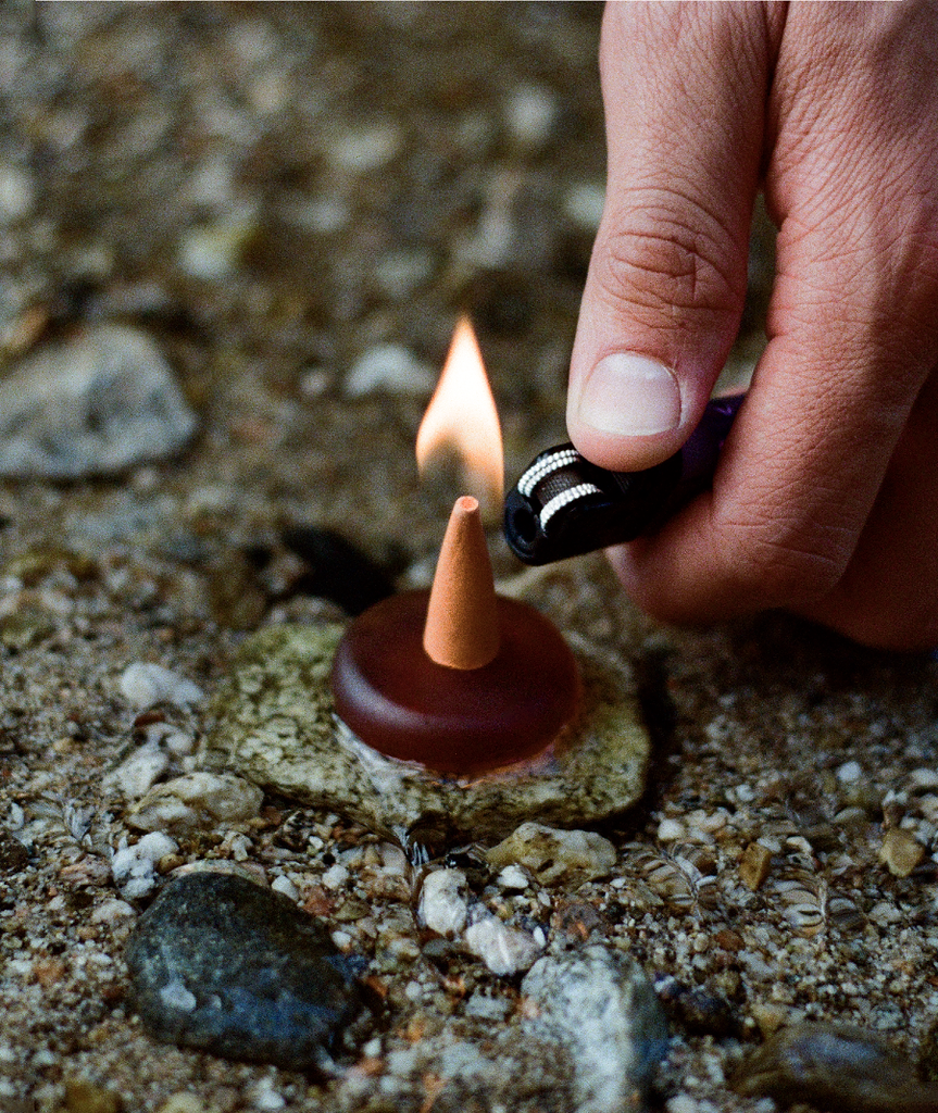 Place your droplet on top of the sea glass holder, grab your light, light the tip of your droplet and gently blow out after a few secs. Now, settle down & let the flame burn.